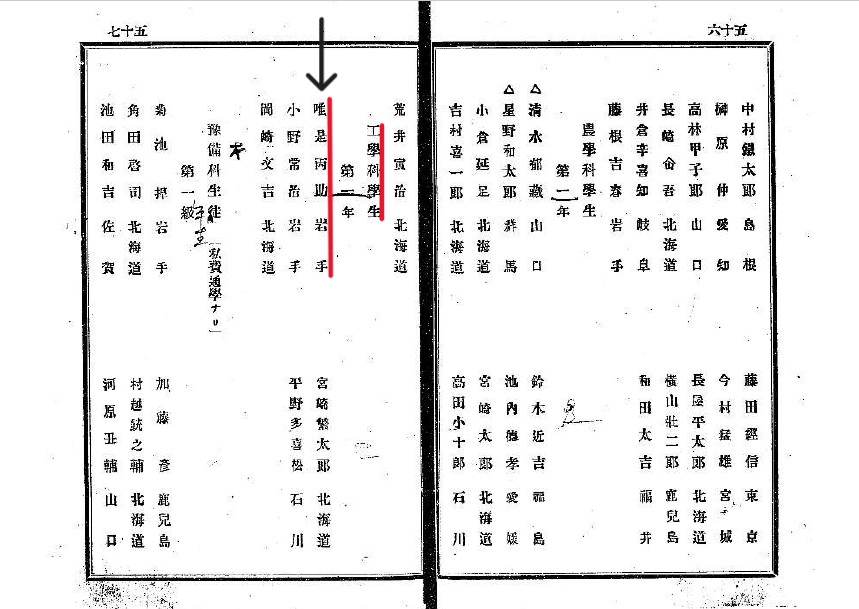 丙助は首席で工学科へ進みます。同期入学は、丙助、岡崎文吉、小野常治、平野多喜松、宮崎繁太郎の計5名です。このうち、岡崎と平野は他校から入学してきました。予備科から進んだ者は、丙助、小野、宮崎の3名です。